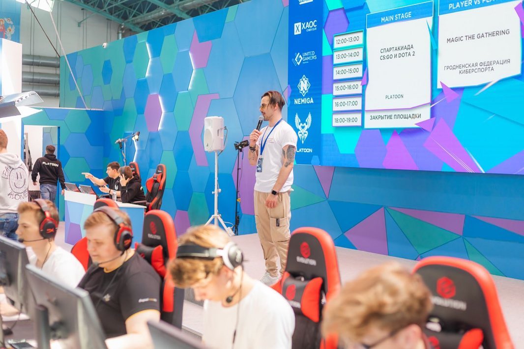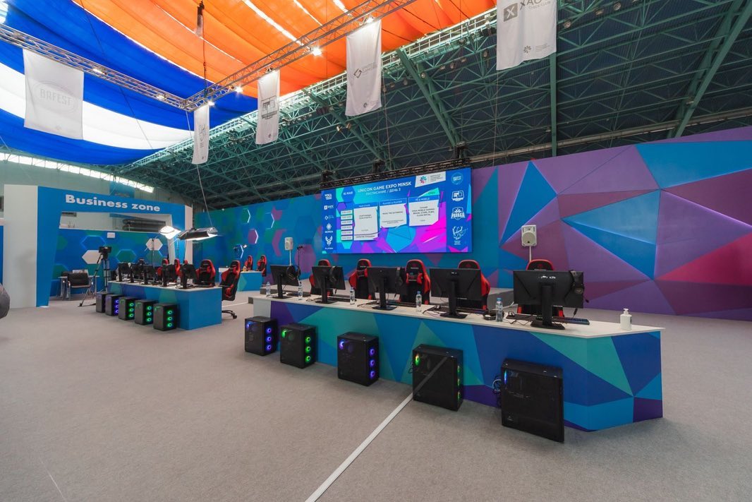 Техническое сопровождение (звук, экраны, плазменные панели) стенда Белорусской ассоциации компьютерного спорта — Soundcafe, Live Spot, Blackout Studio.